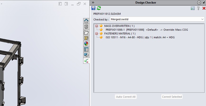 Create SolidWorks design checker task, what look all components in assembly and return only one what have “Plain” in fail name, ignore weld nuts, contain “DIN 929” in fail name. Plain is defining fasteners without surface.